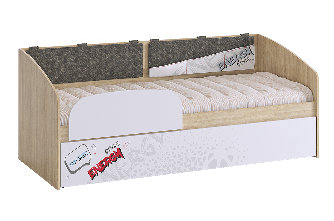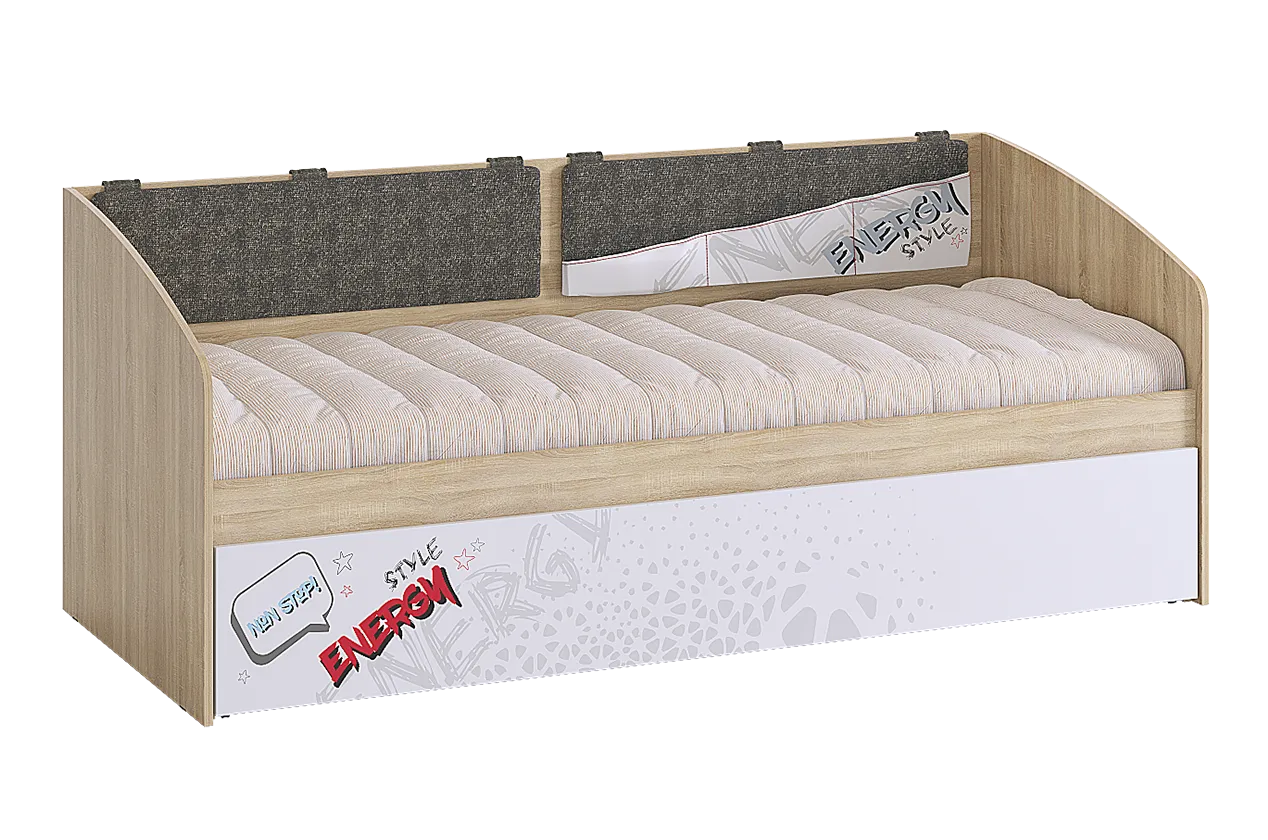 Эта кровать станет ярким элементом интерьера в комнате вашего ребенка. Просторный ящик для хранения белья также может служить дополнительным спальным местом. Мягкие накладки на спинке добавляют уют и комфорт.