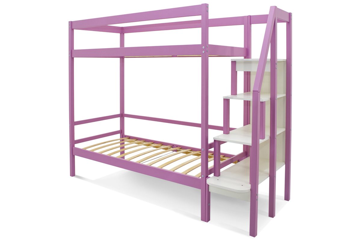 Кровать оборудована практичной лестницей-стеллажом. Полки лестницы можно использовать для игрушек, книг, ночника. Лестницу легко зафиксировать как справа, так и слева от кровати, что очень удобно. На каждом ярусе установлено прочное ортопедическое основание из 12 лат. Спальное место выдерживает нагрузку до 200 кг.