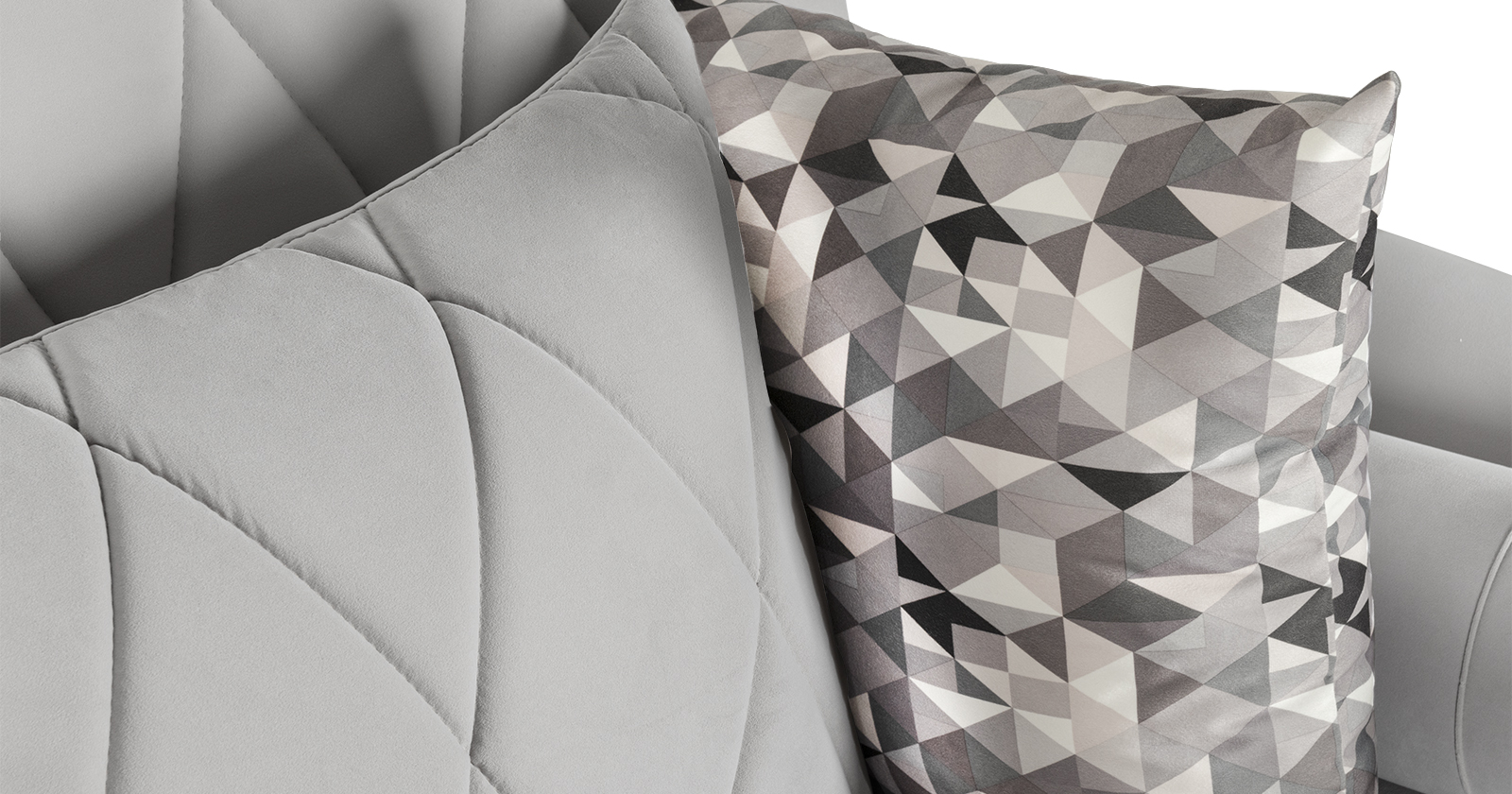 Декоративные подушки выполнены из микровелюра с геометрическим орнаментом в духе актуальных макро-трендов.