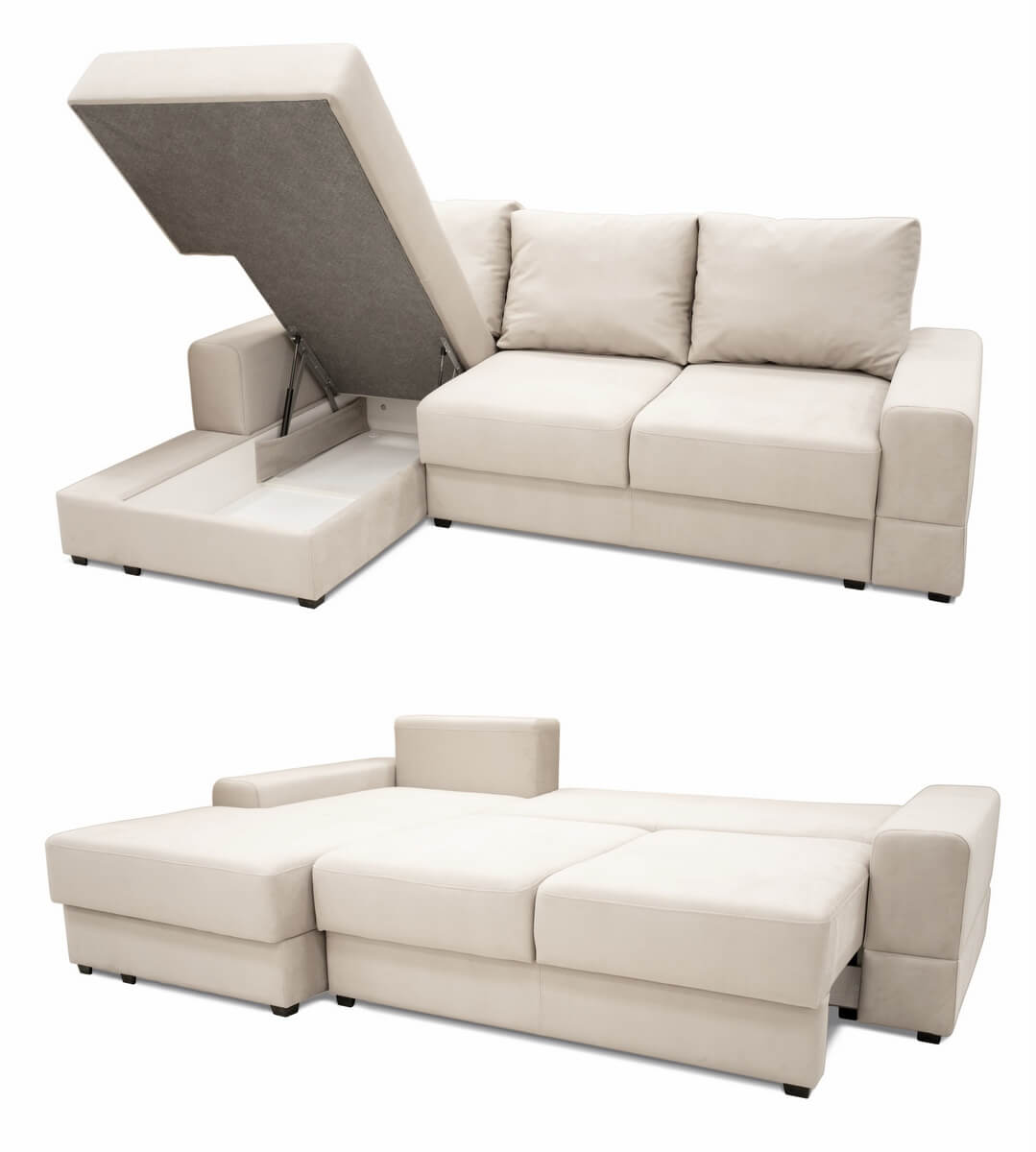 Диван имеет систему трансформации «тик-так». Так же диван укомплектован тремя большими подушками в единой ткани с диваном. Состоит из дивана со спальным элементом и оттоманки. Имеет 2 вместительных короба для хранения