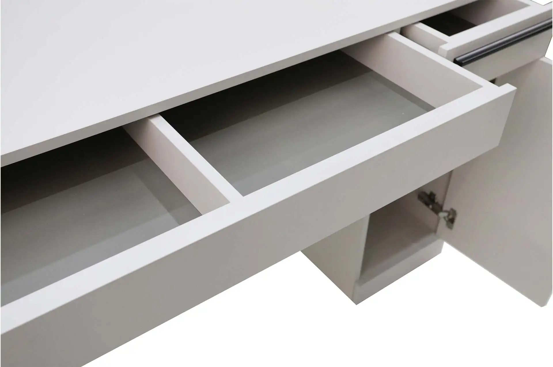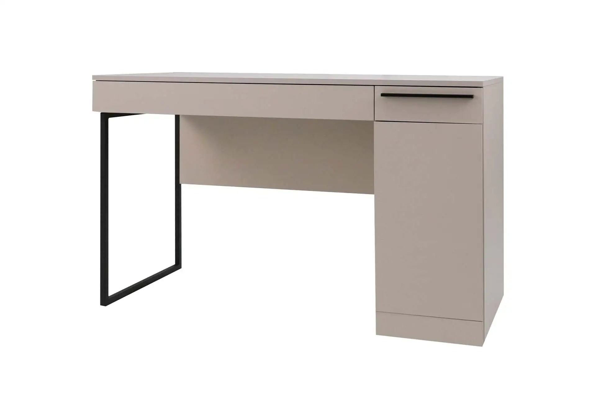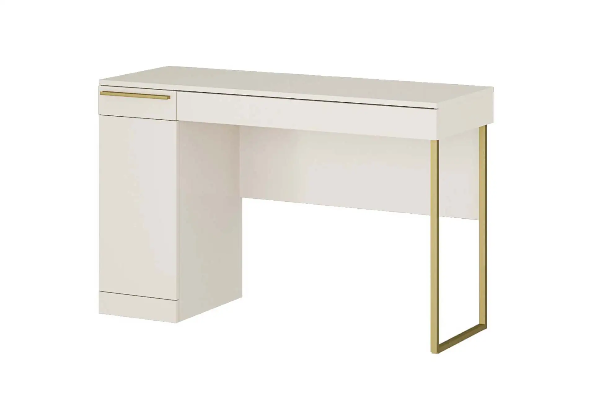 Стол письменный выполнен в популярном цвете кашемир. В тумбе установлен выдвижной ящик и полки для хранения. Имеется возможность выбора стильной металлической опоры и ручки для ящика в цвете сатиновое золото или в лаконичном черном цвете.