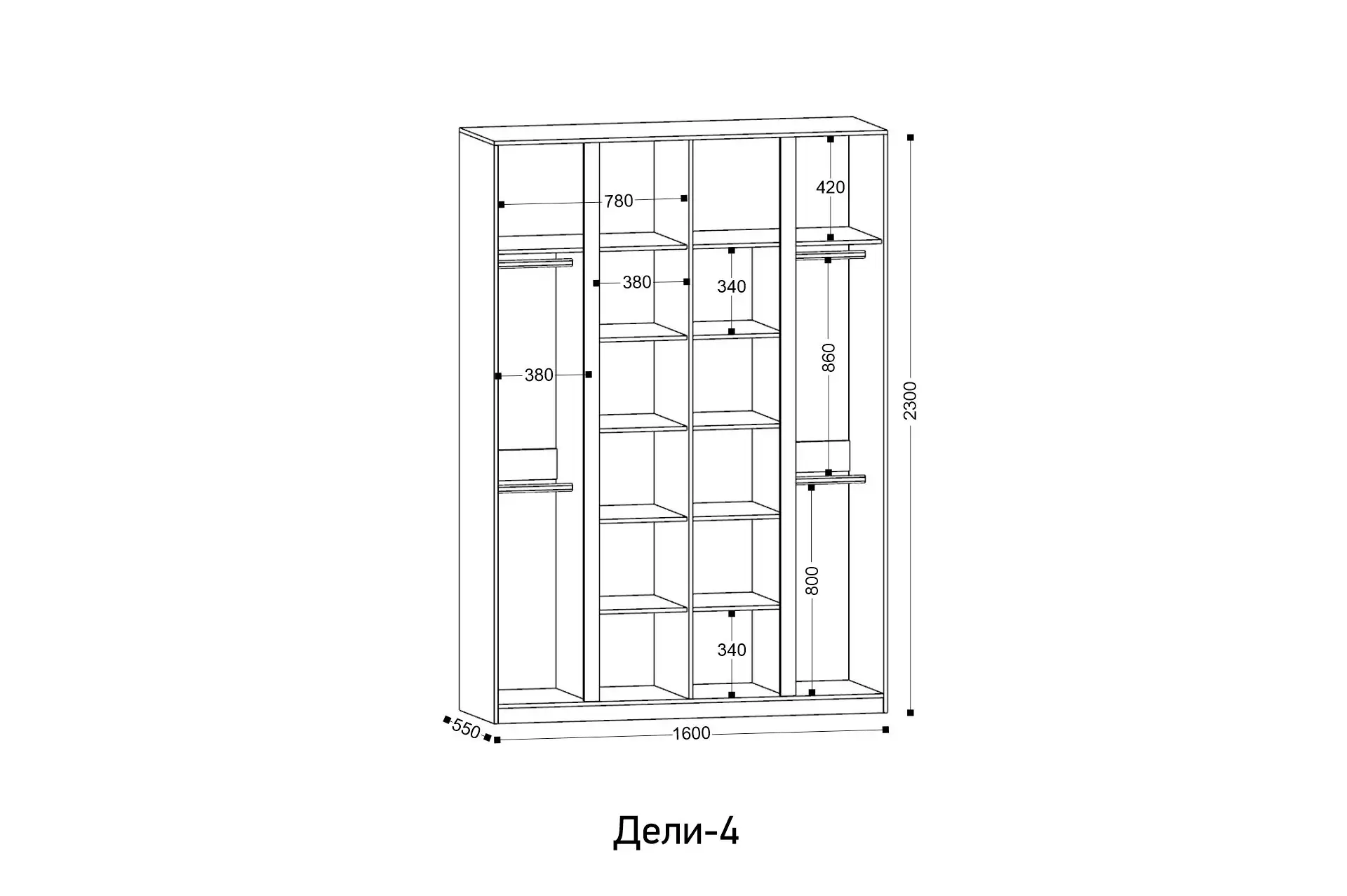 Ширина: 1600 мм | Глубина: 550 мм | Высота: 2300 мм