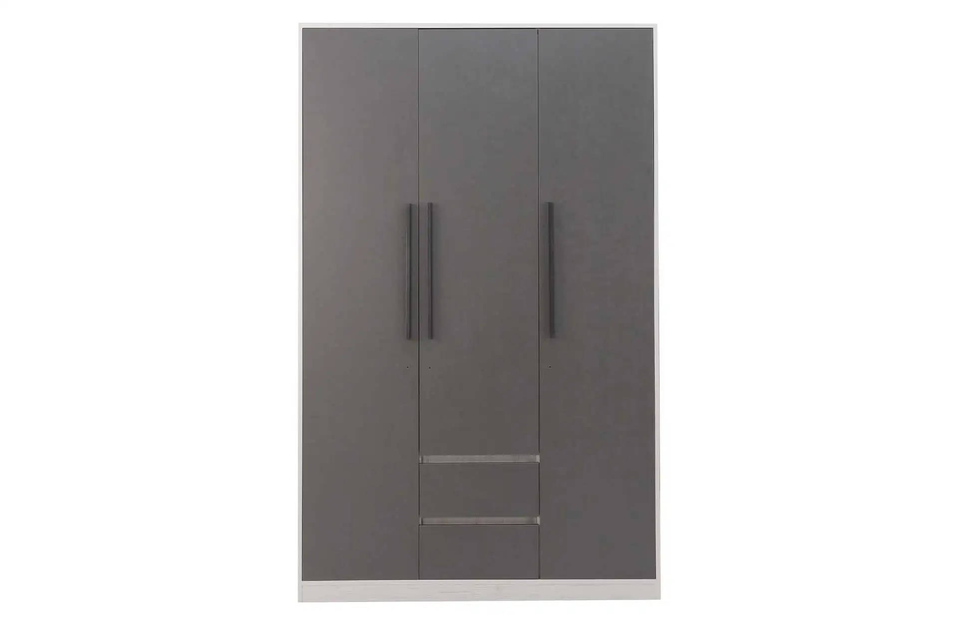 Распашной трехстворчатый шкаф оснащен всем необходимым для организации хранения вещей: штангой, полками и выдвижными ящиками. Сочетание современных трендовых фактур, стильный графитовый цвет придают особый шарм интерьеру.